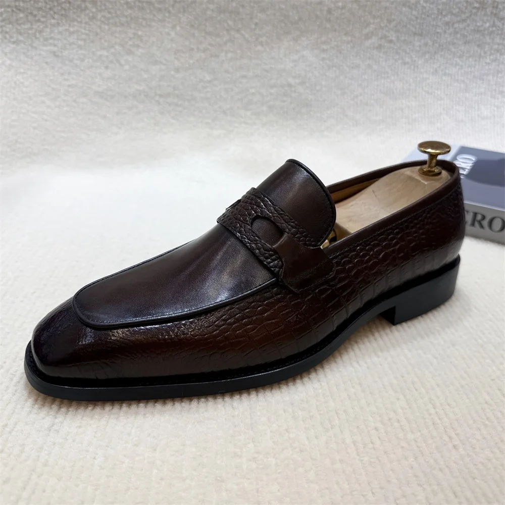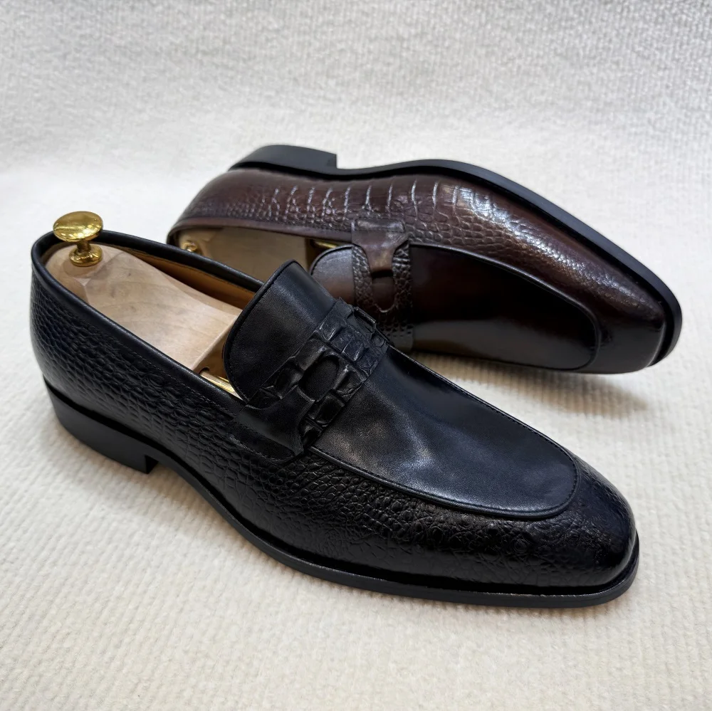 Luxury Men’s Genuine Leather Dress Shoes Crocodile Print Wedding Loafers Double Buckle Business Office Formal Slip-On Shoes