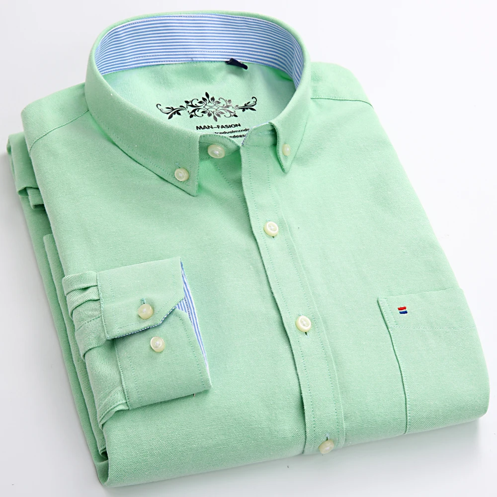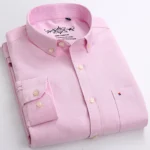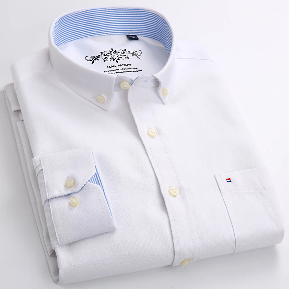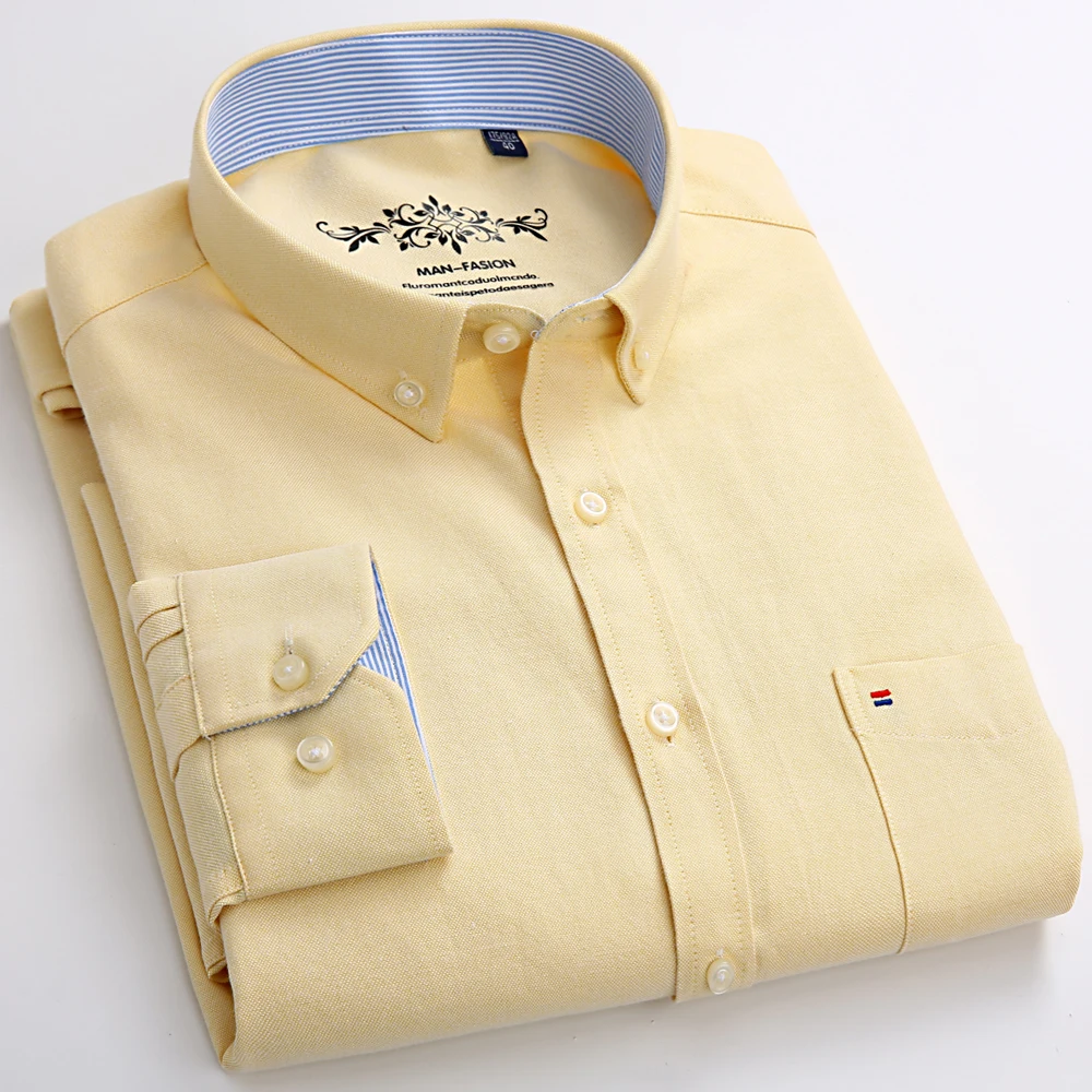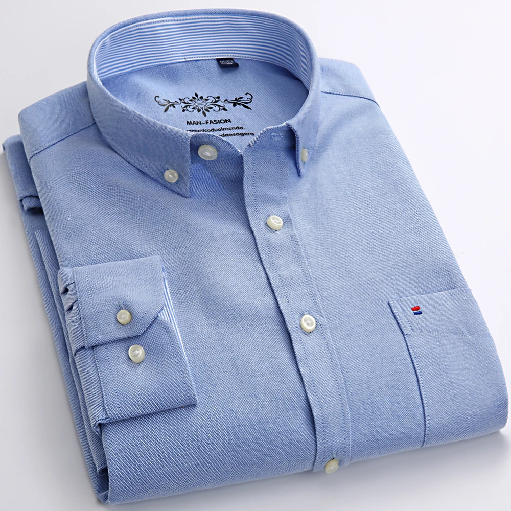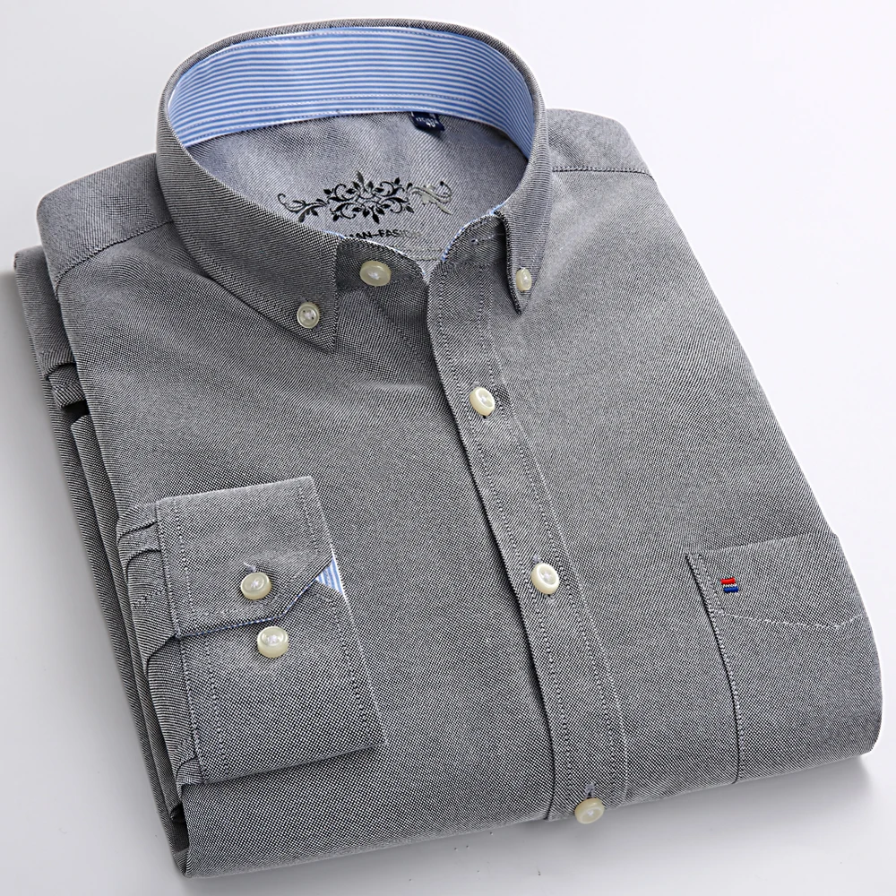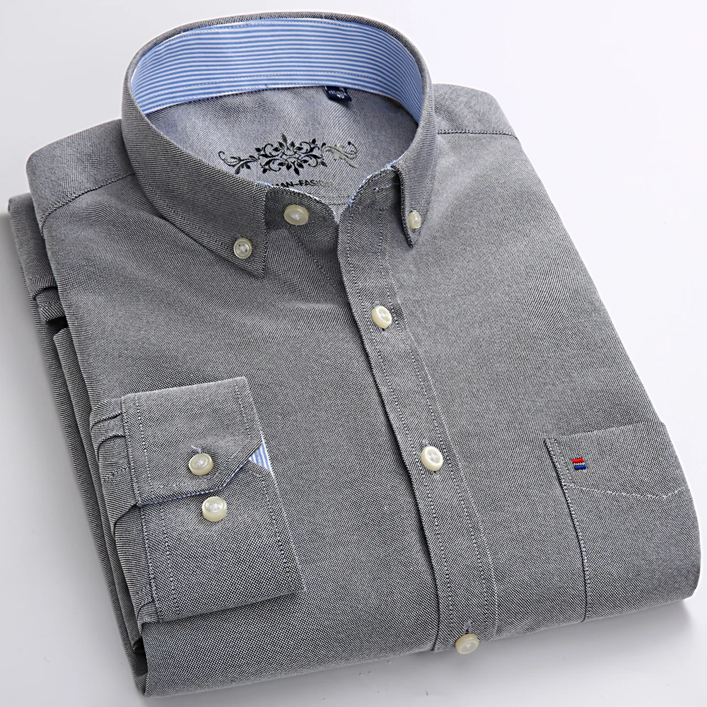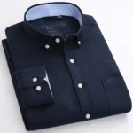 Men’s Fashion Long Sleeve Oxford Work Shirt Single Patch Pocket Simple Design Embroidered Regular-fit Casual Button-down Shirts